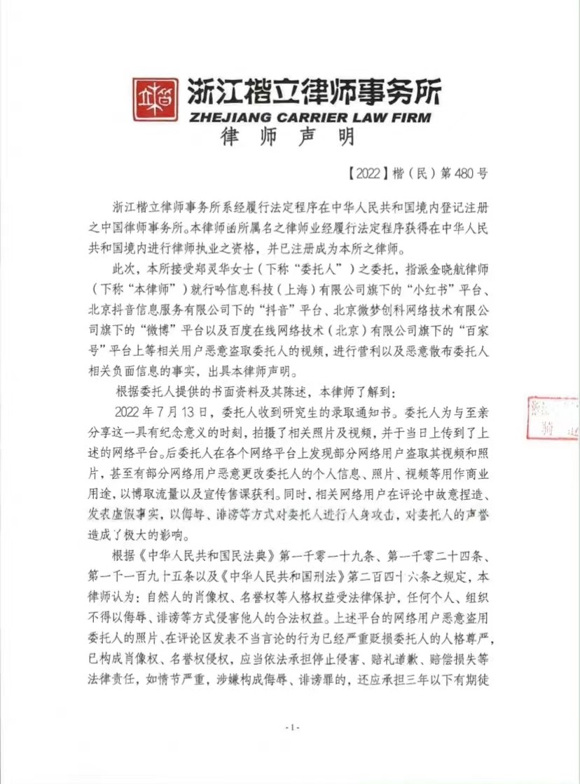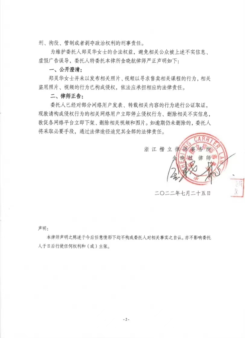 7月25日,为维护自己的合法权益,避免相关公众被不实信息和虚假广告误导,当事人郑灵华委托我所金晓航律师发布律师声明,作出了公开澄清:当事人并未以发布相关照片、视频以寻求售卖相关课程的行为,相关盗用照片、视频的行为已构成侵权,依法应承担相应的法律责任。