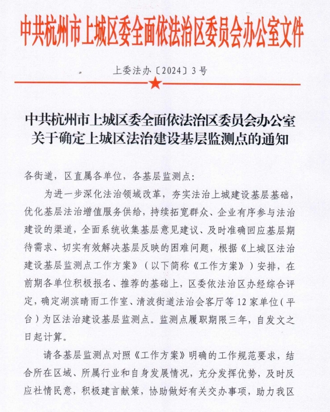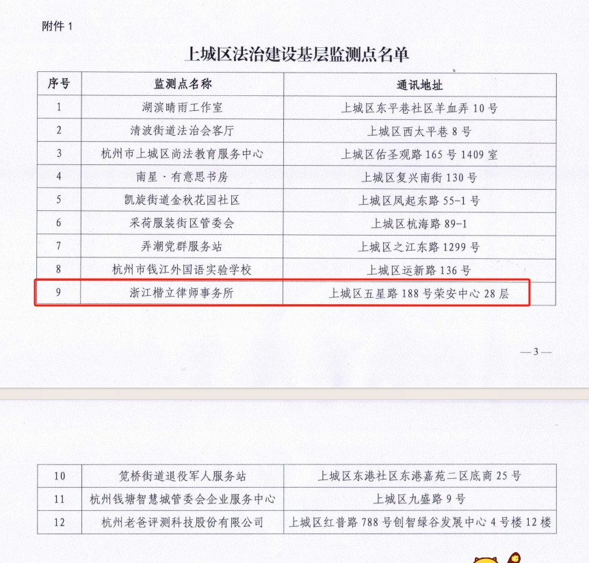 楷立荣誉丨楷立律师事务所被授予“上城区法治建设基层监测点”